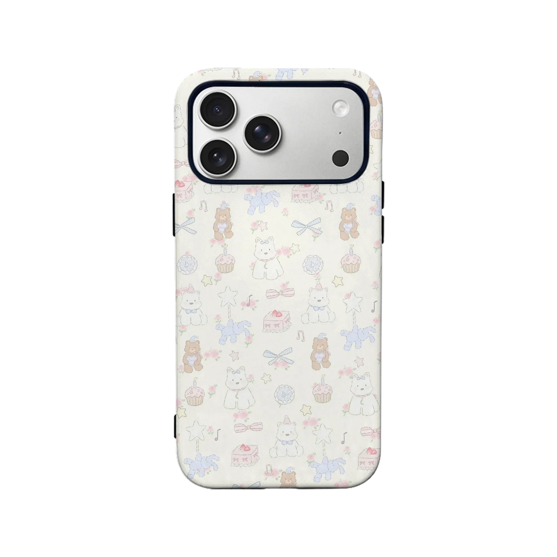 Brighten your phone with the Cream Cartoon Phone Case. Featuring a delightful mix of cartoon cats, bears, cupcakes, bows, and stars on a soft cream background, this case adds a touch of sweetness and charm to your everyday essentials. Perfect for those who love playful and whimsical designs.