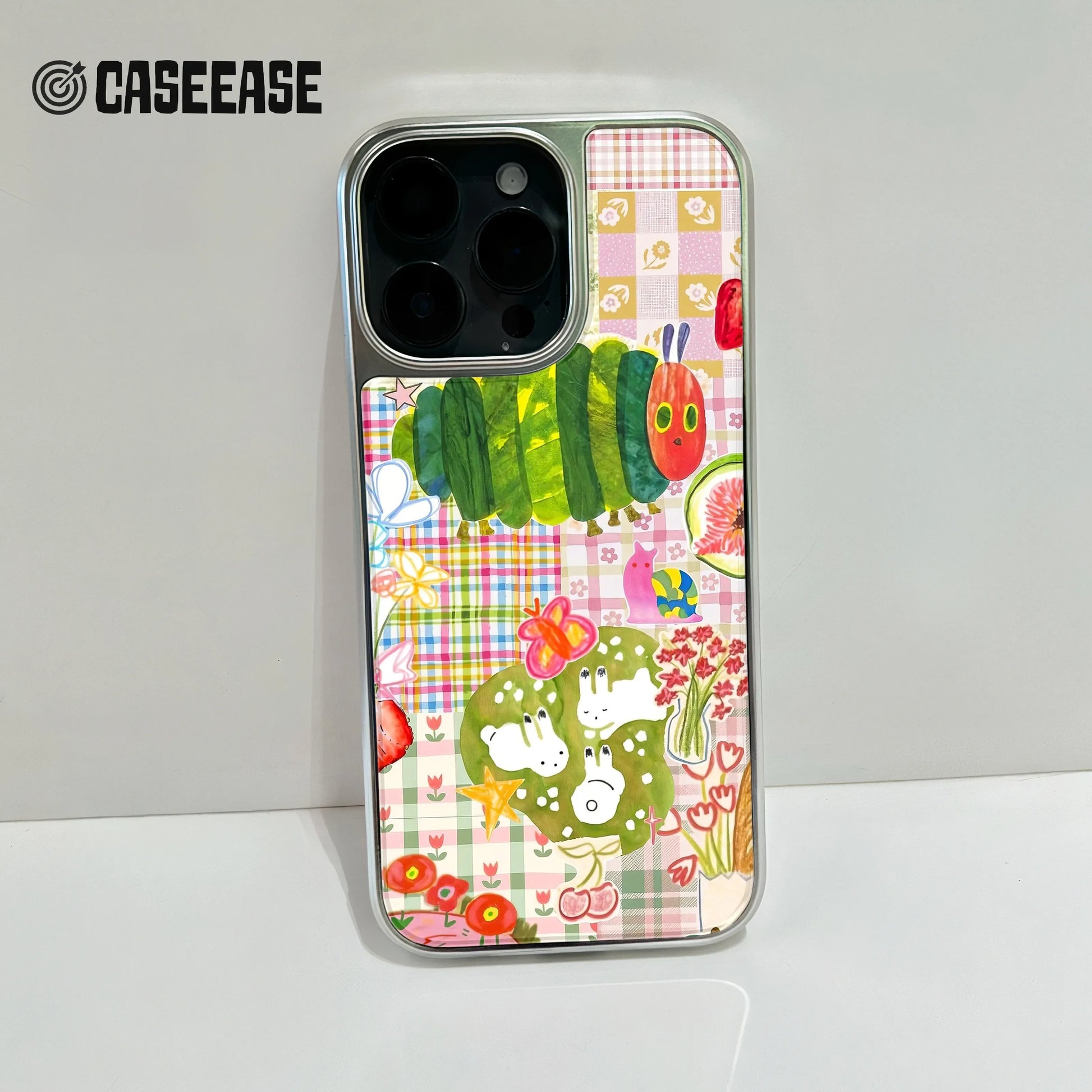 Embrace vibrancy with the Holographic Chrome Caterpillar Phone Case. This playful design showcases a colorful caterpillar against a whimsical background filled with fruity motifs and charming characters, making it perfect for those who love to express their personality through art.