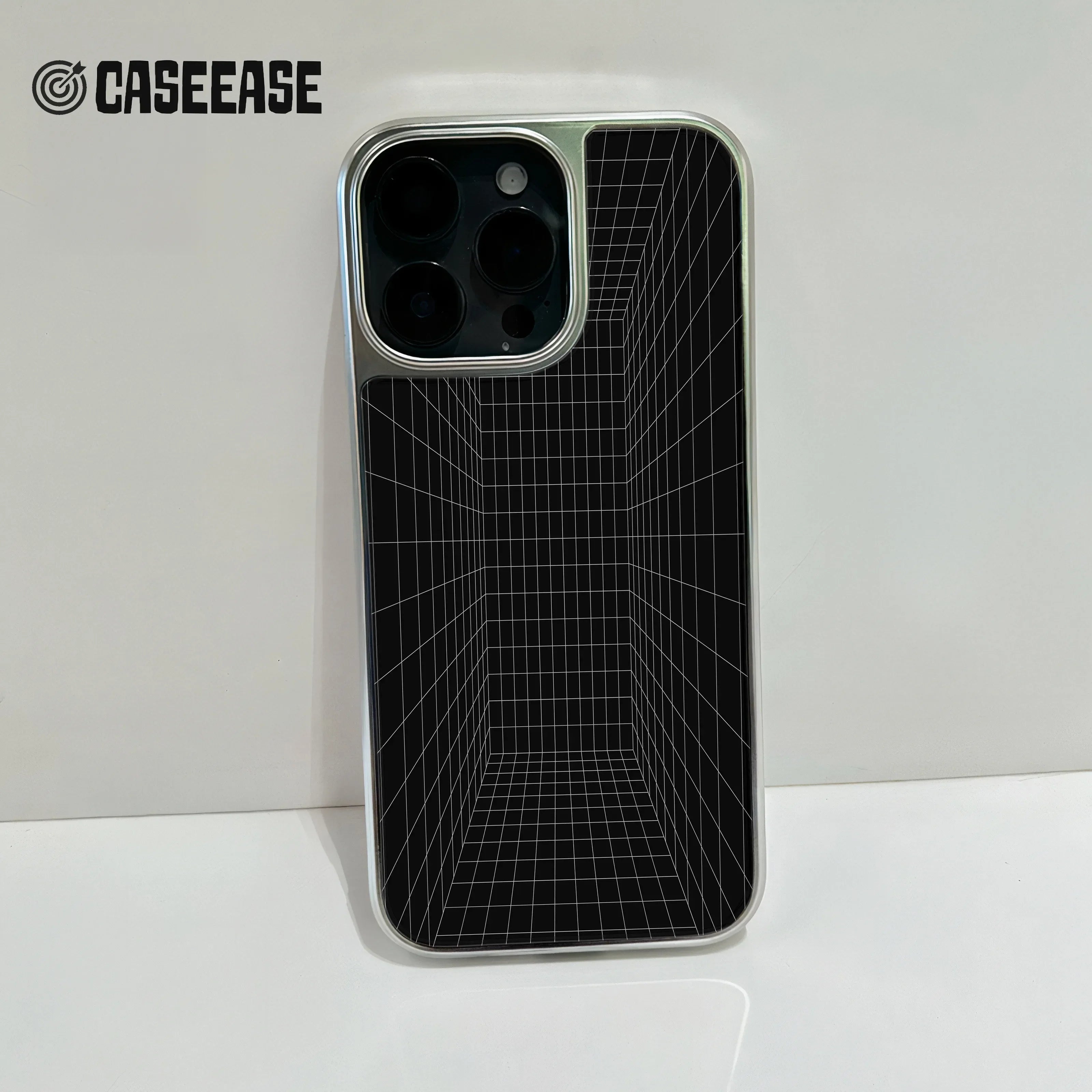 The deep black background contrasts beautifully with the crisp white grid lines, offering a sense of depth and dimension that captivates the eye. Crafted with Electrosilvering Technology, this phone case ensures a durable and scratch-resistant chrome-like surface, keeping your device safe while maintaining its sophisticated appearance.