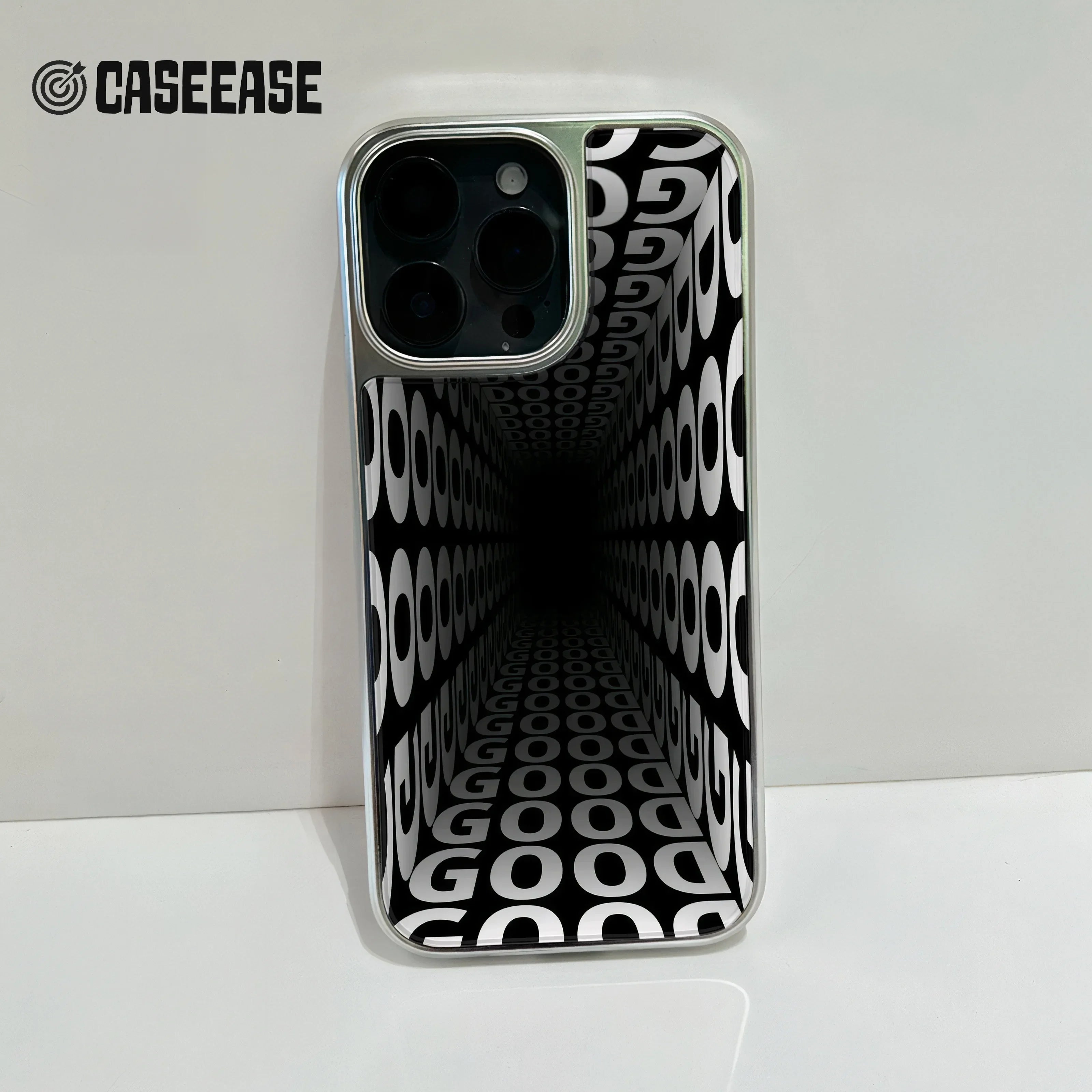 Experience a new dimension of style with our Holographic Chrome Phone Case for iPhone 15 Pro, featuring an intriguing optical illusion design that plays with perspective and light. The striking black and white pattern creates an illusion of depth, making your phone a captivating piece of art.