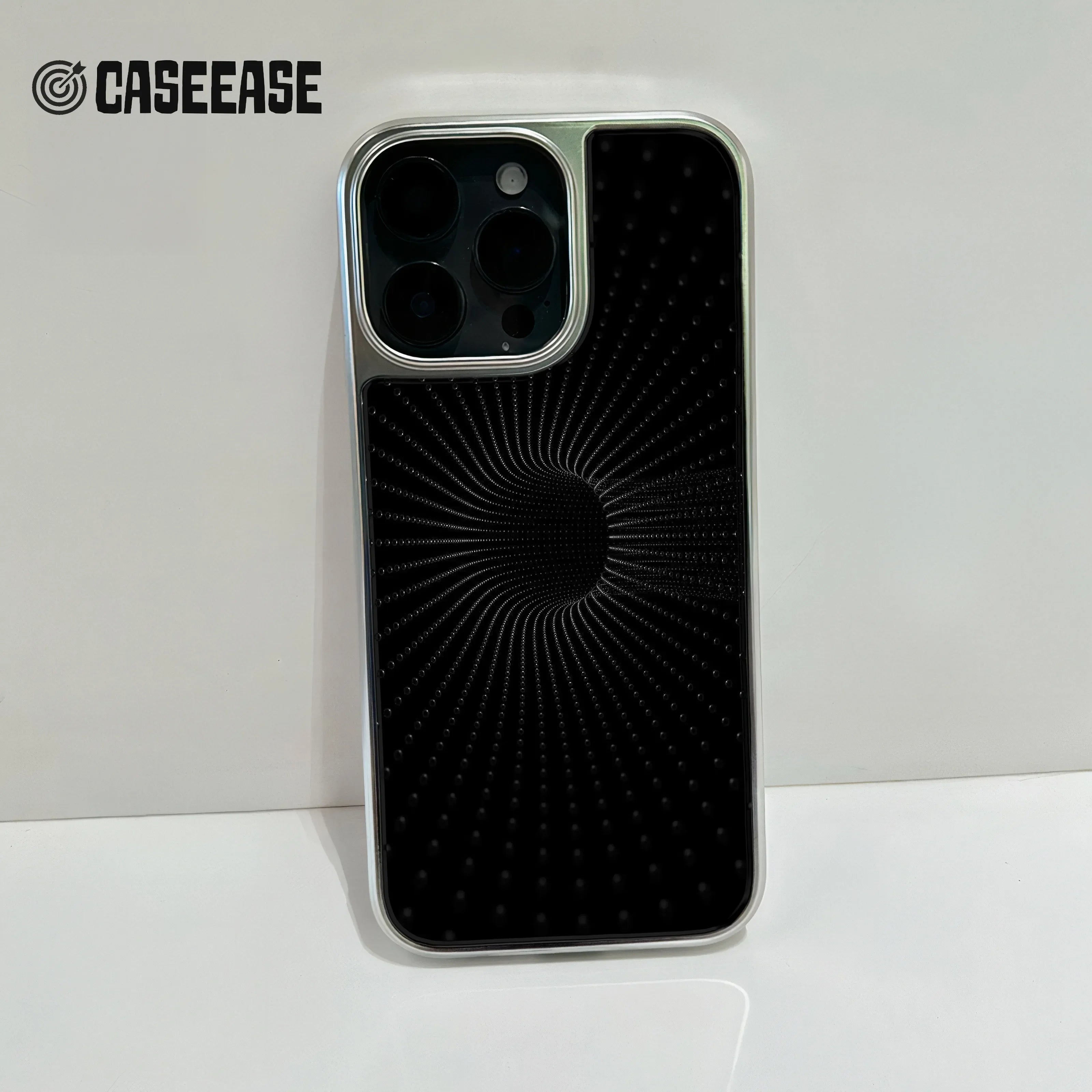 Discover the elegance of the Holographic Chrome Phone Case for iPhone 15 Pro, featuring a striking black spiral design that captivates the imagination. This unique case creates an illusion of depth and movement, while the holographic chrome finish adds a modern twist to your device.