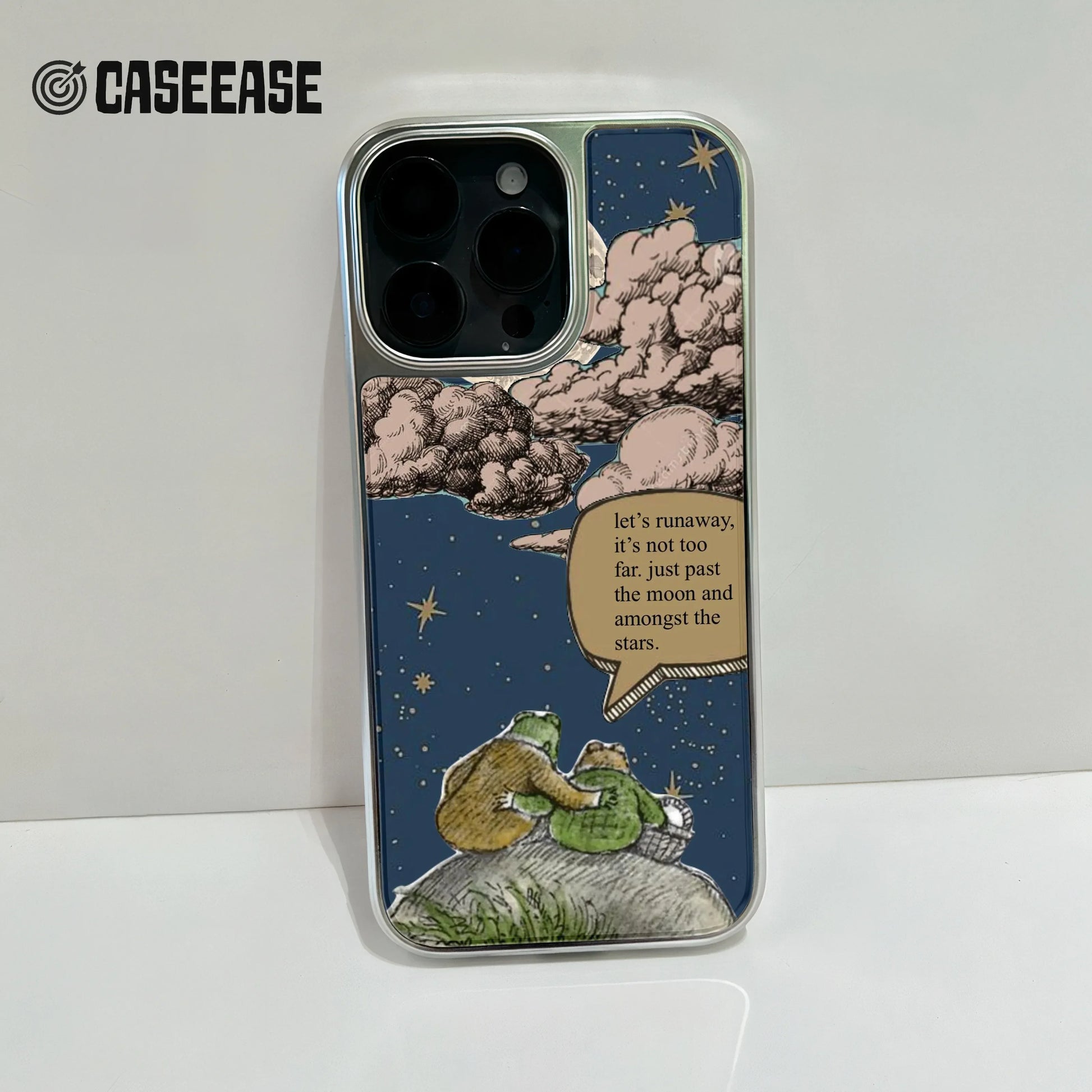 Embrace the magic of the cosmos with our Holographic Chrome Phone Case featuring a whimsical design of frogs under a starry sky. This enchanting illustration captures a moment of adventure with the quote, “let’s runaway, it’s not too far. just past the moon and amongst the stars.”