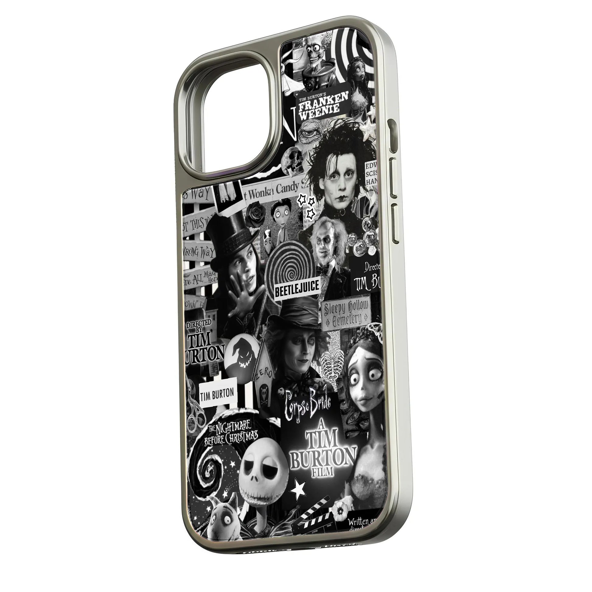 Embrace the whimsical and dark charm of Tim Burton with our Holographic Chrome Phone Case. This striking design showcases a collage of iconic imagery from beloved Burton films, such as 'Beetlejuice' and 'The Nightmare Before Christmas', all presented in a unique black-and-white aesthetic with touches of holographic detail.
