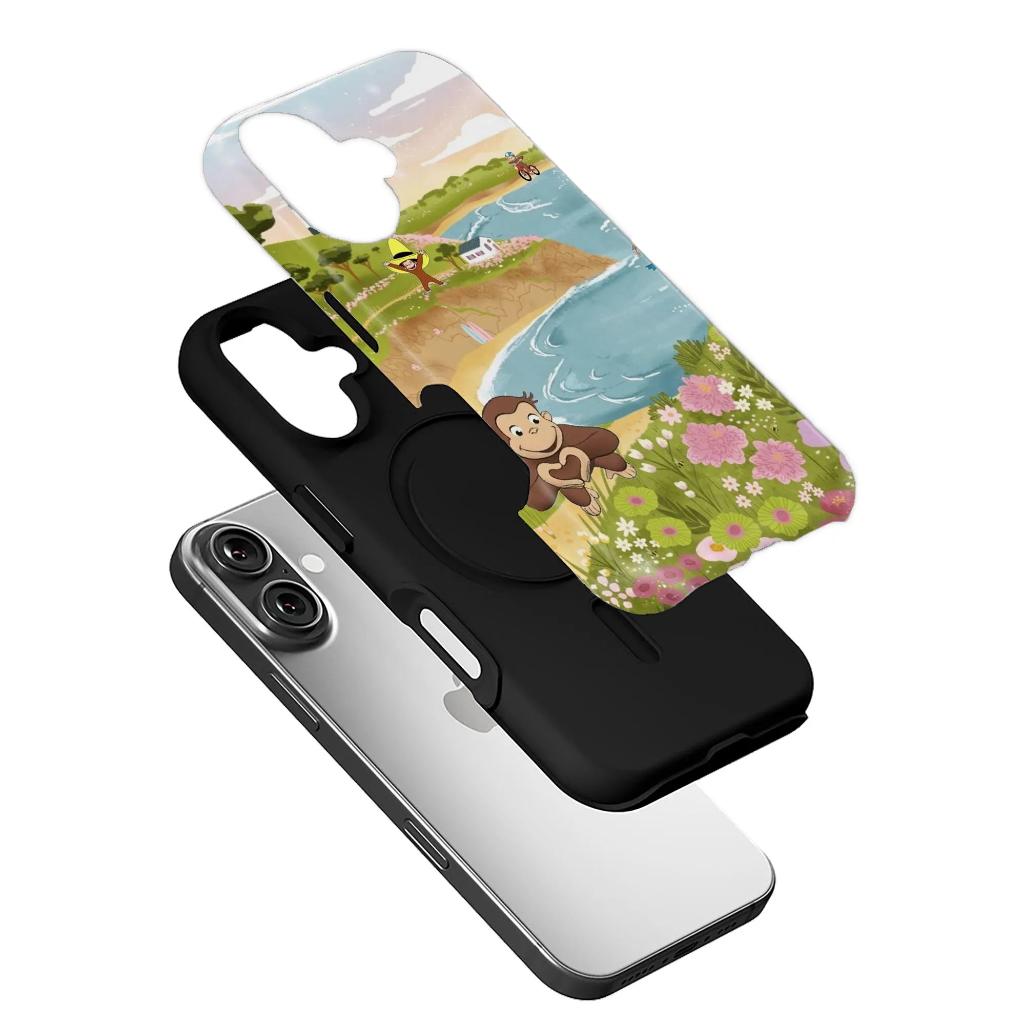 Bring joy and whimsy to your everyday life with the Playful Curious George Phone Case. This delightful design features the beloved monkey, Curious George, surrounded by vibrant flowers and a serene coastal landscape, capturing the essence of playfulness and adventure.