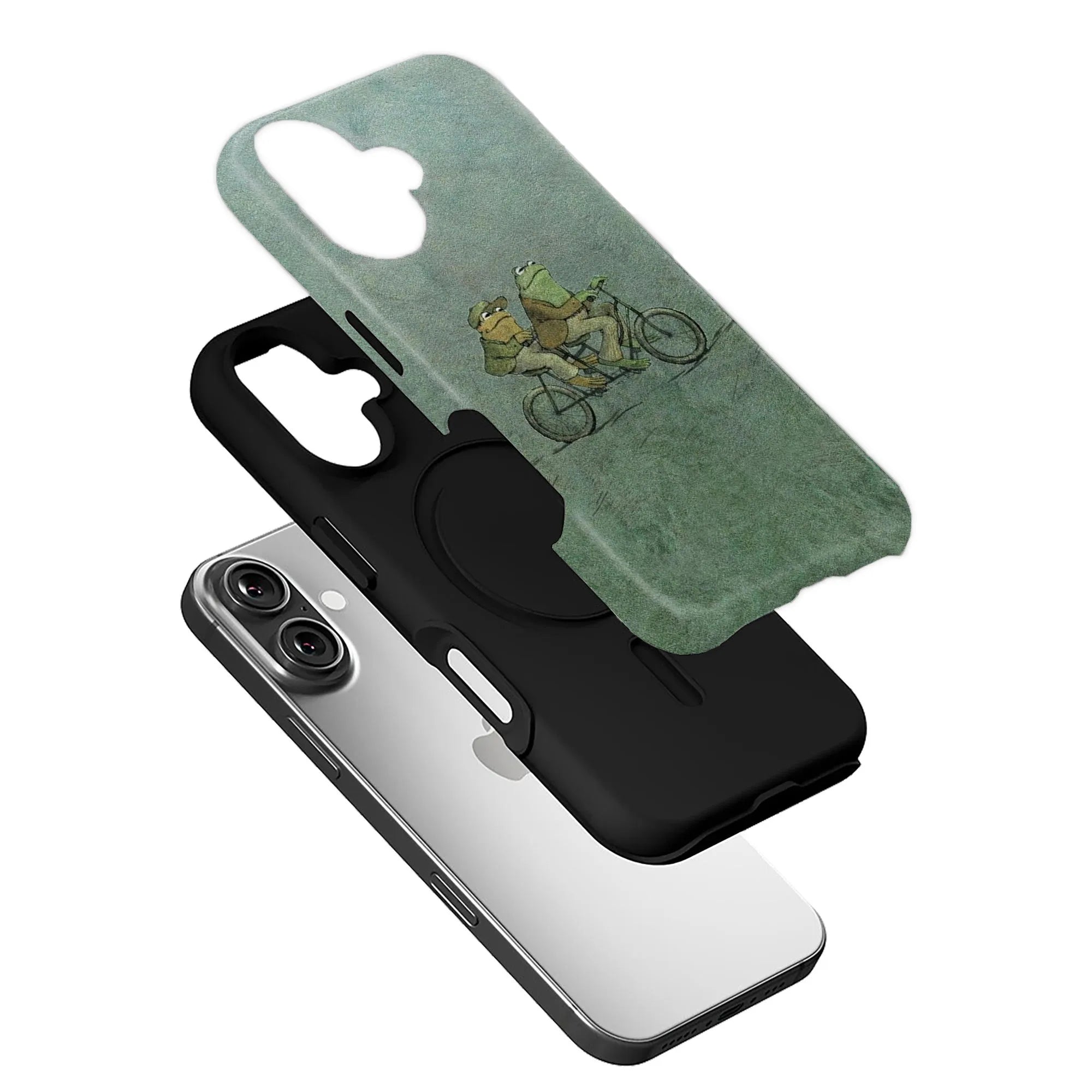 Embrace whimsy with the Playful Frog Bicycle Phone Case. Featuring an adorable illustration of two frogs joyfully riding a bicycle, this design adds a fun and lighthearted touch to your daily essentials.