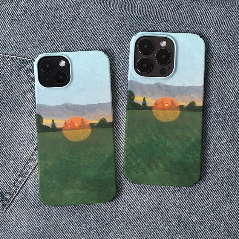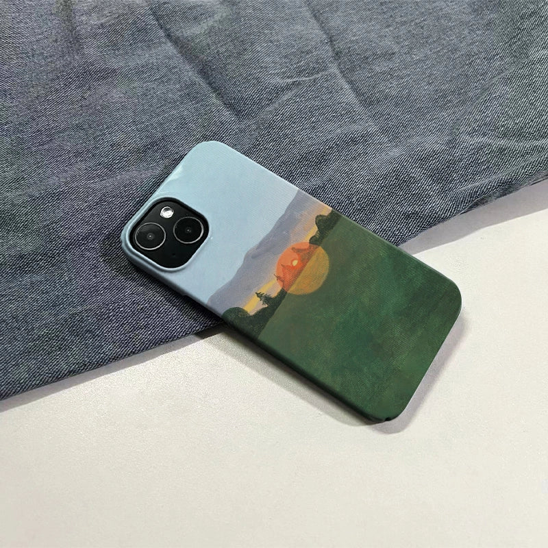 Capture the beauty of a serene sunset with this nature-inspired phone case. Featuring a warm, glowing sun descending behind distant hills and trees, this design brings a touch of tranquility to your daily life. Perfect for nature lovers and those who appreciate peaceful landscapes, this phone case offers a moment of calm wherever you go.